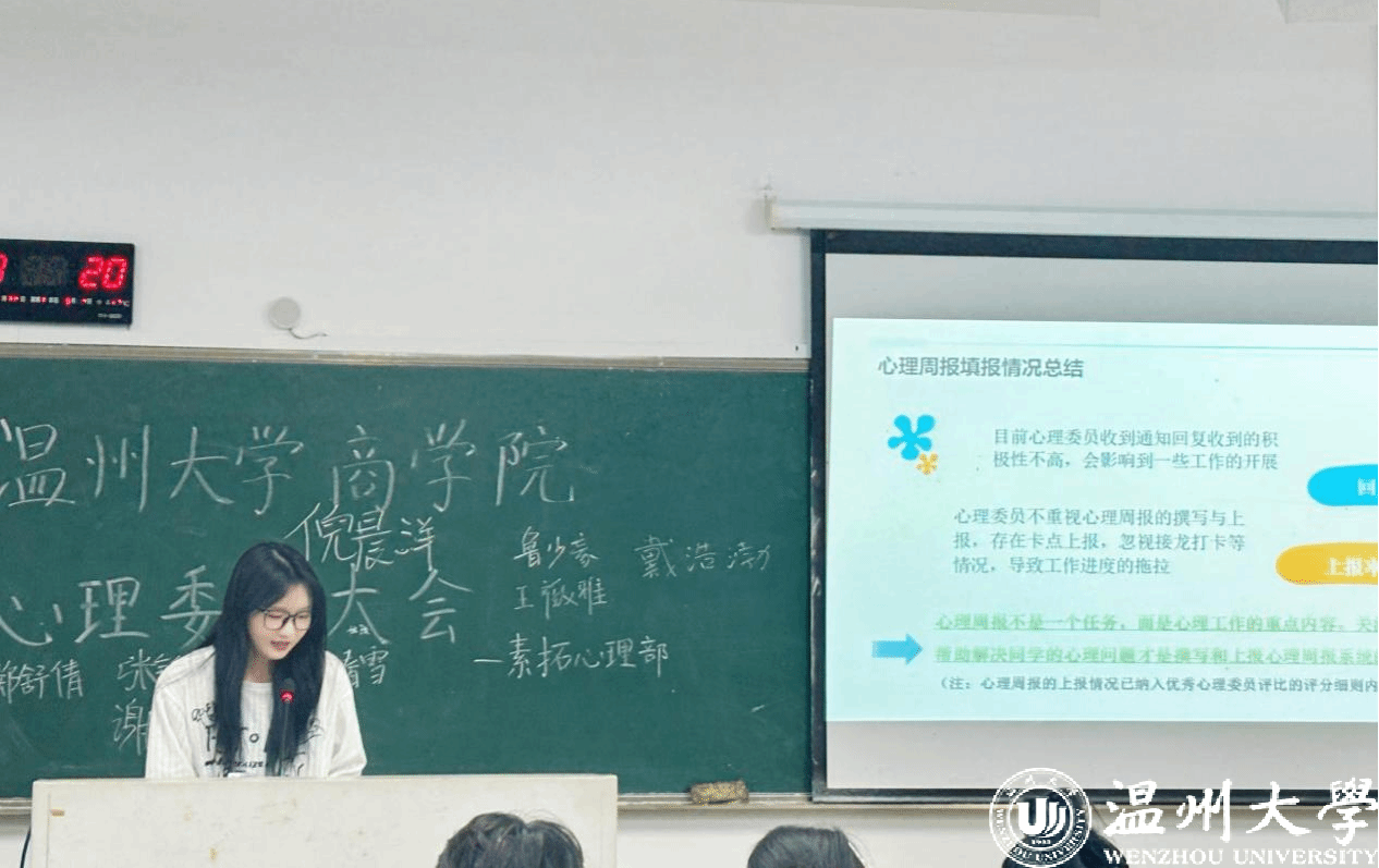 紧接着,素拓心理部部长陆佳乐示范心理周报系统的填报以及校内外登录的路径。心理周报不仅是记录学生心理健康状况的工具,也是心理委员及时发现问题、提供支持的有效途径。心理委员们通过使用系统,能够更有效地了解同学们的需求,提高心理健康教育活动与服务的针对性和有效性。