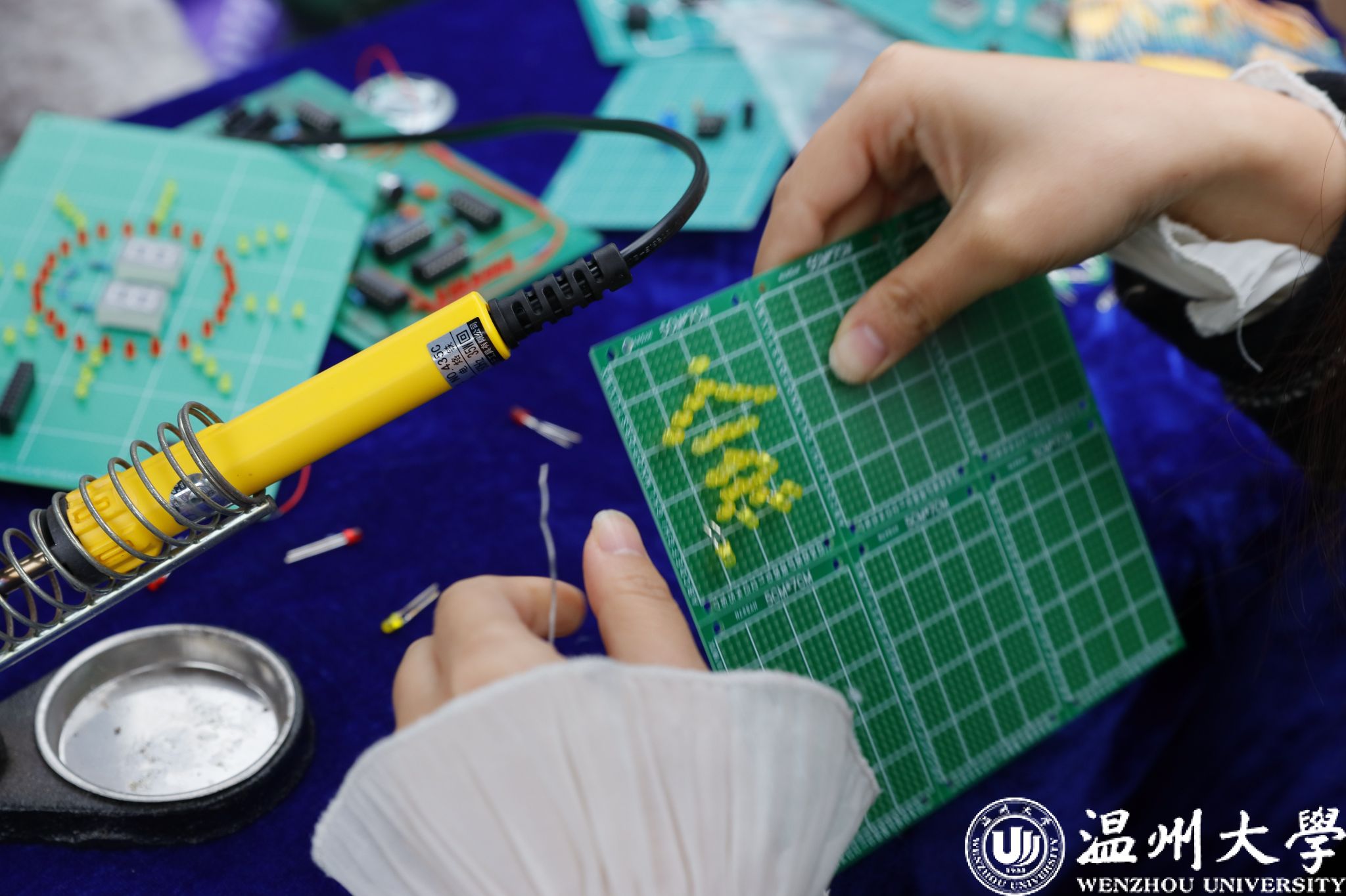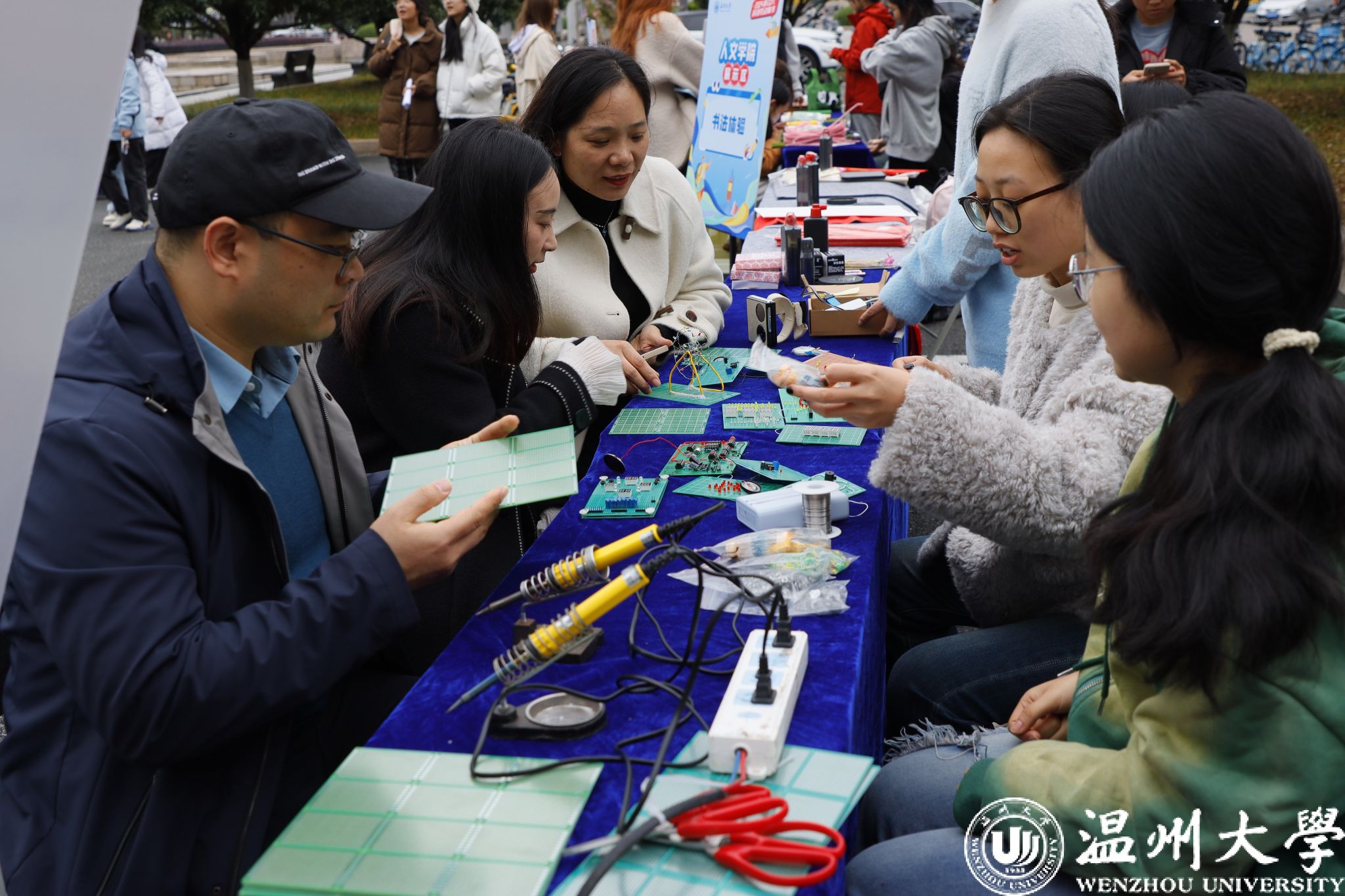 电气与电子工程学院学生团队,带来了学院特色的电路板供各学院师生共同参与,吸引众多师生驻足体验,展现出科技与生活紧密结合的创新理念。