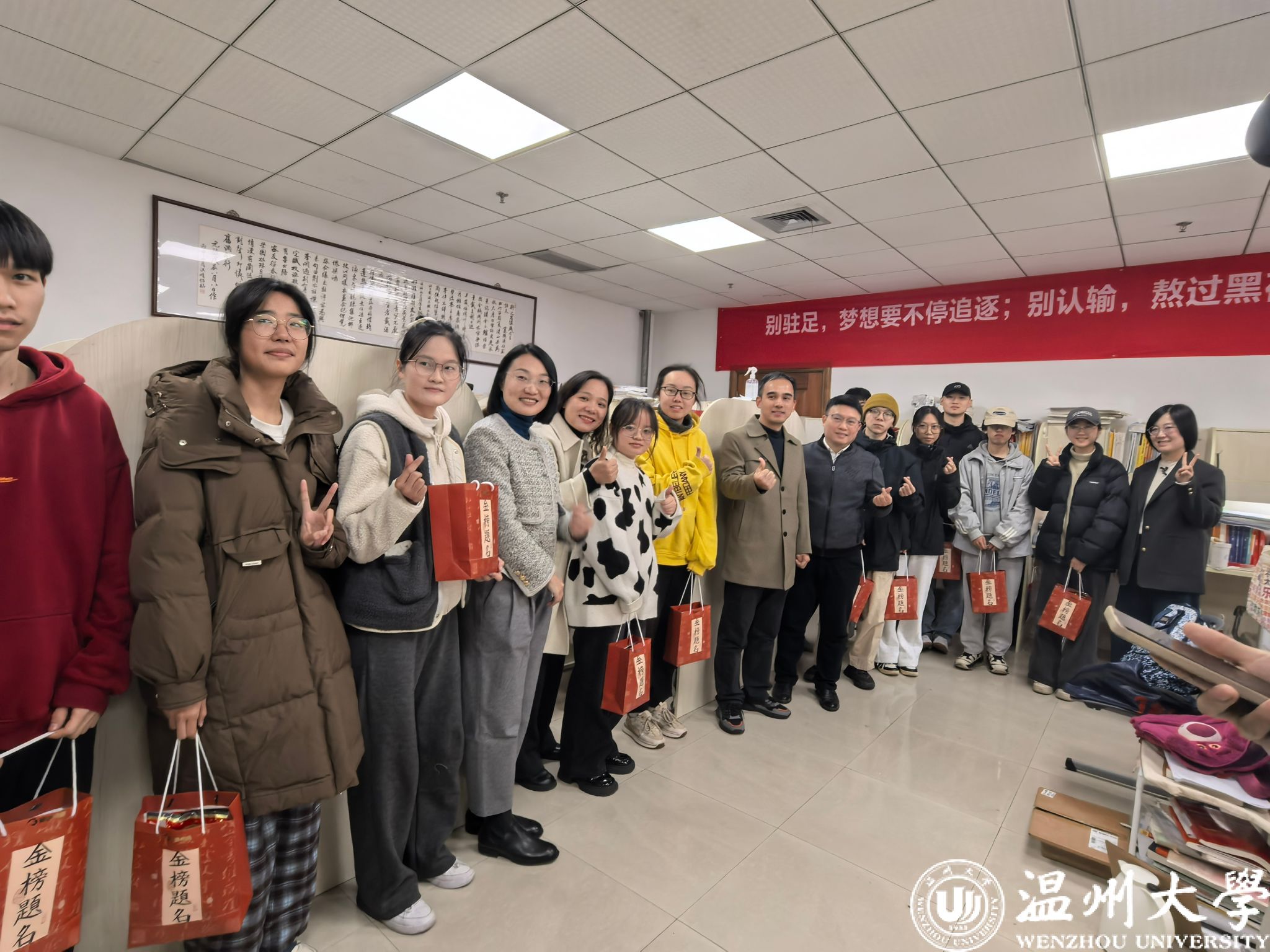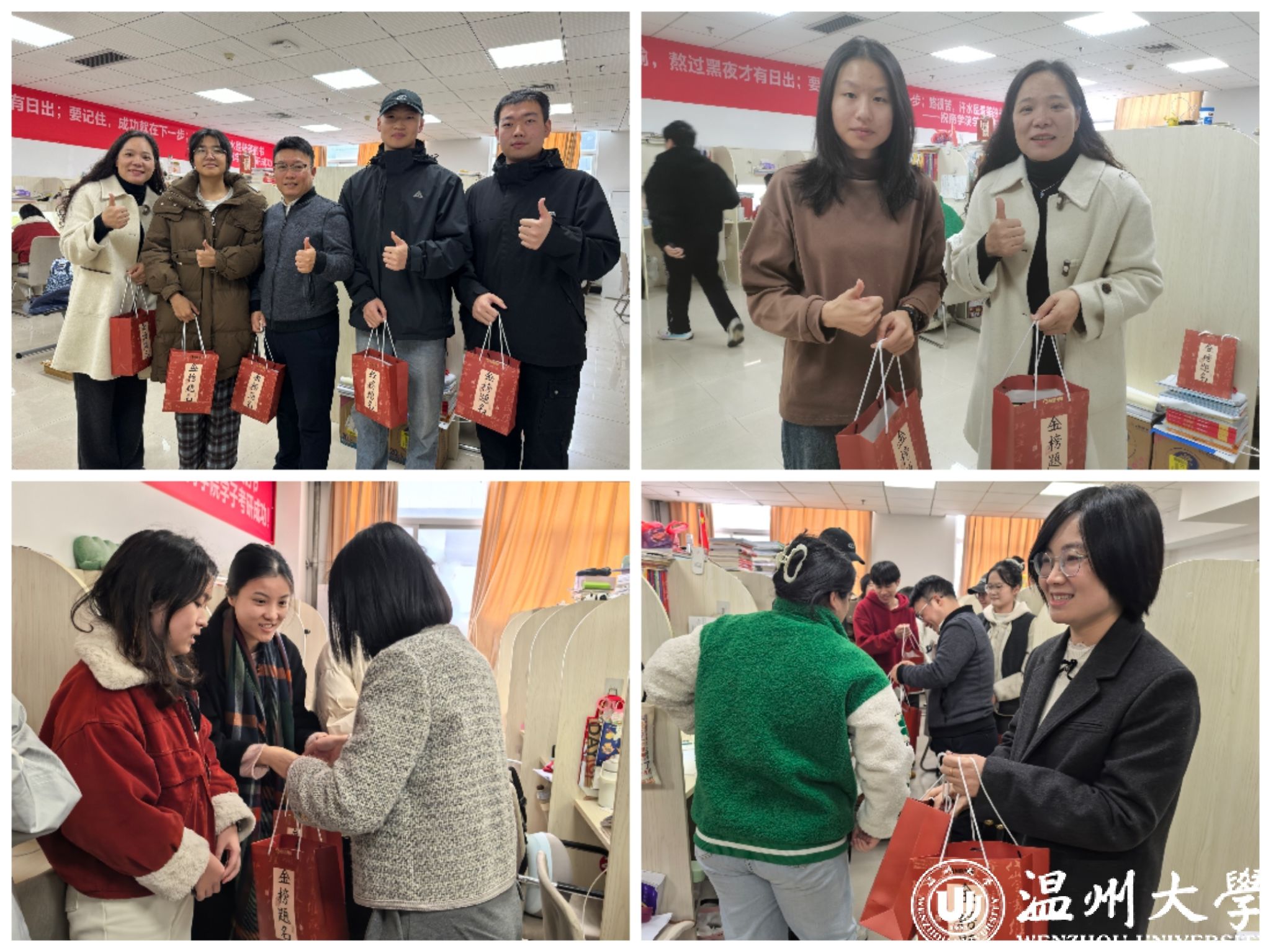 慰问团队送上精心准备的慰问品,巧克力祝考试顺滑、旺旺雪饼祝考运旺旺、升升薯条祝各位升学顺利等一一送到学子们手中。这些慰问品不仅是物质上的补给,更代表着对他们坚持梦想的肯定与期许。慰问过程中,各位领导与考研学子亲切交流。他们关切地询问学子们的备考情况,对大家的努力和付出表示高度赞赏,同时叮嘱要注意劳逸结合,合理安排作息时间,保持良好的身心状态迎接考试。“你们不是一个人在战斗,学校和老师会一直为你们保驾护航。”一句句暖心的话语,如冬日暖阳,驱散了学子们心头的压力与疲惫。