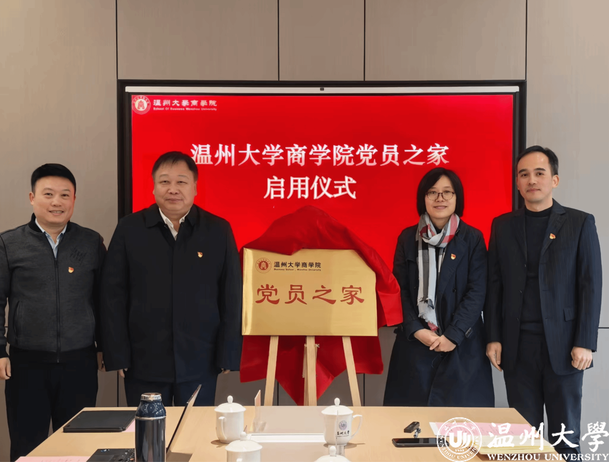 党员之家启用仪式,赵敏校长、韦小青副部长与学院领导班子一起为党员之家揭牌。