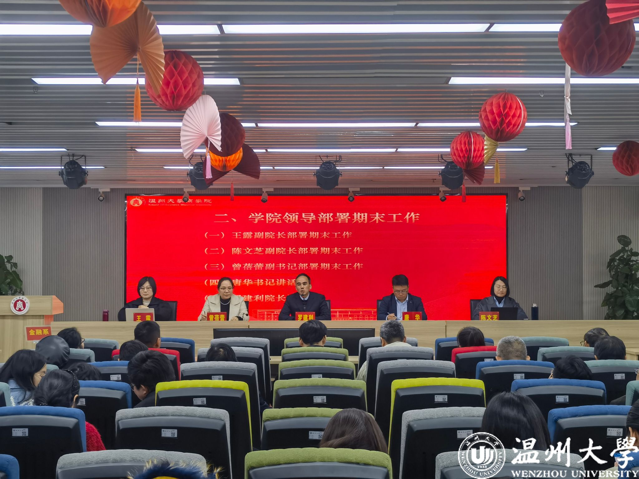 各分管领导部署学期末各项工作。王露副院长就期末考试和本科审核评估的工作安排进行了部署,提醒各位老师要严格监考和改卷,共同维护期末考试纪律。假期要积极配合本科审核评估工作,将教学材料电子化。陈文芝副院长总结了过去一年学院在学科建设、科学研究、服务地方、研究生培养等方面取得的成绩,并提出了对未来新的一年学院在专业建设方面的工作设想。曾蓓蕾副书记对期末安全工作进行了部署,主要针对关注学生期末心理问题、宿舍消防安全、离校安全、寒假留宿情况、意识形态安全与考场纪律等工作提出了具体建议。