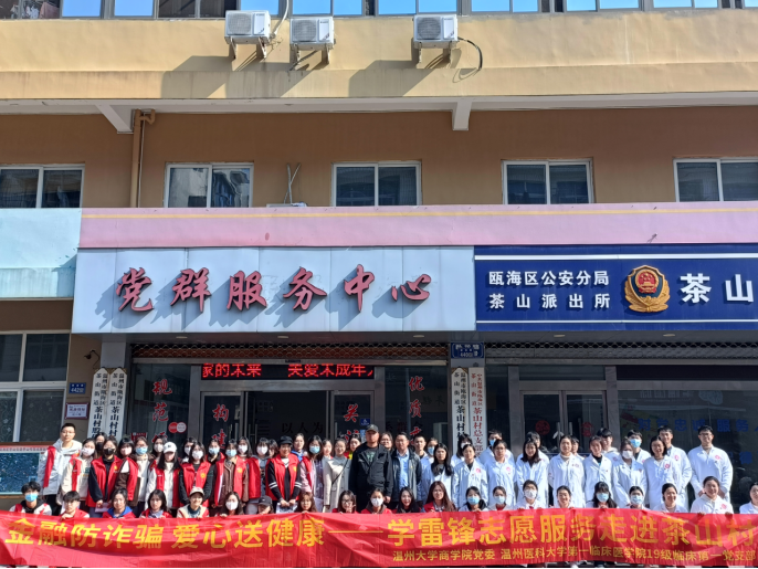 与温州医科大学临床医学院的学生党员们赴瓯海博园社区、茶山村等地开展“金融防诈骗,爱心送健康”主题志愿服务活动,为社区居民普及金融知识,提供医疗健康服务。