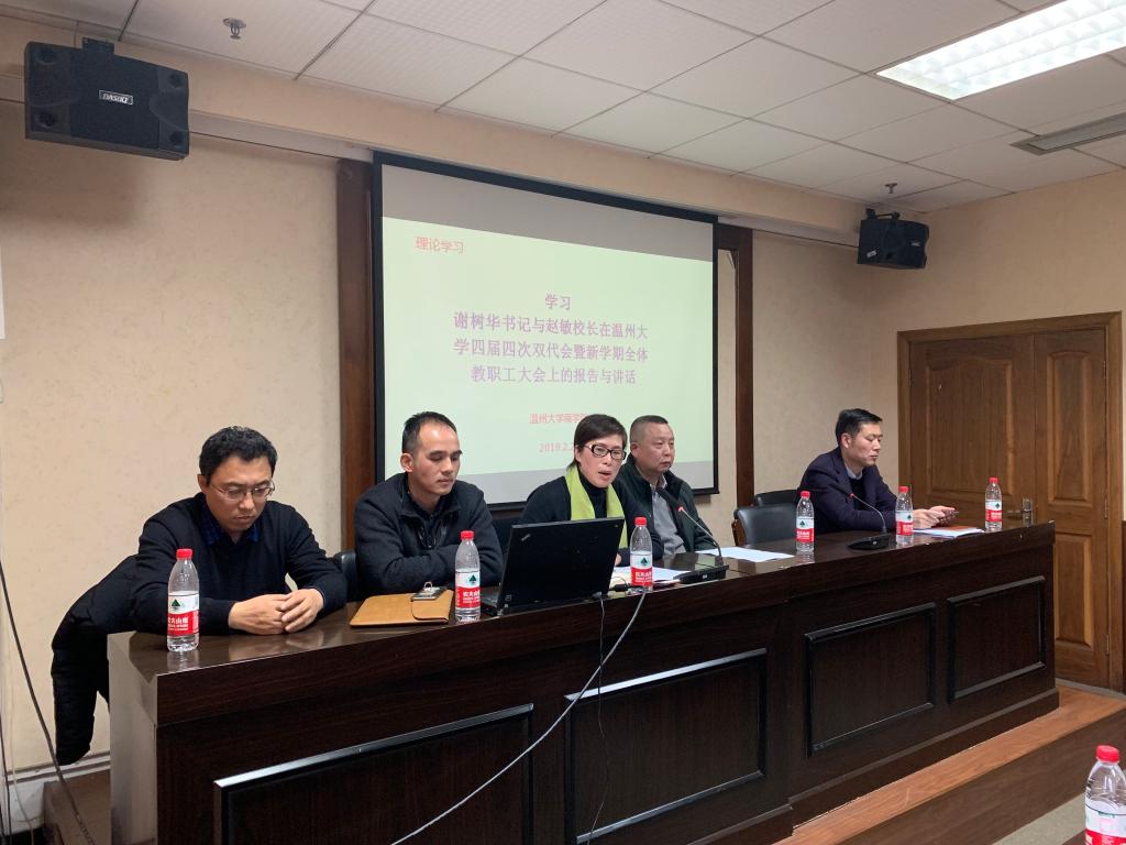 2月27日下午,我院全体教职工齐聚一堂集中学习了谢树华书记和赵敏校长在温州大学四届四次双代会暨新学期全体教职工大会上的讲话与报告精神。