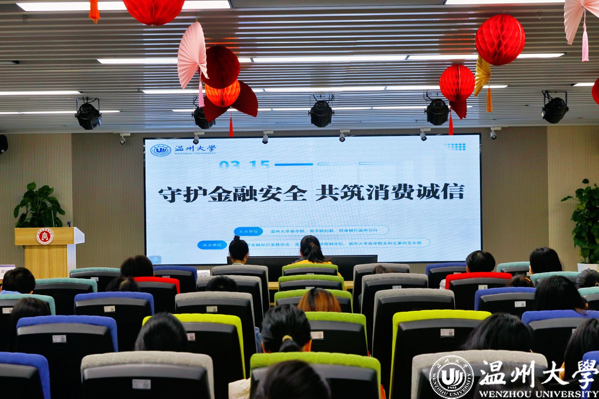 随后,招商银行温州分行黄彬彬老师通过“案例剖析+趣味问答”形式,为学生带来了一堂生动的金融小课堂《消费者权益保护与金融安全》,内容涵盖反诈防骗、个人信息保护、理性借贷等金融常识,激发了学生的参与热情,使金融知识在轻松氛围中深入人心。